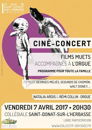 7 avril 2017 , ciné-concert à l’orgue, Collégiale de Saint-Donat, Saint-Donat-sur-l’Herbasse, Drôme (26), sur l’orgue de la Collégiale – Collectif Odyssée