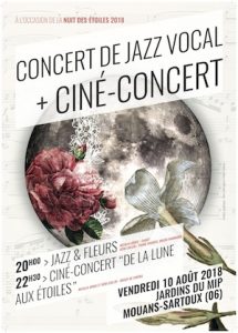 Musée International de la Parfumerie de Grasse, dans les jardins du Musée à Mouans-Sartoux, le vendredi 10 août pour la Nuit des Étoiles, Alpes-Maritimes (06) – Soirée en deux temps : concert de jazz vocal « Jazz & Fleurs » puis ciné-concert à l’orgue de cinéma sur le thème de l’astronomie