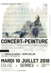 Eglise de Serres le 10 juillet 2018, Hautes Alpes (05) – Peinture-concert à l’orgue avec Rémi Collin sur des tableaux animés de Natalia Ardis et Rémi Collin