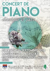 Musée Simon Segal, le 16 septembre 2018 toute la journée : petits concerts de piano jazz (Rémi Collin) et lectures de poèmes (Natalia Ardis) sur le thème « Fleurs et Parfums » à l’occasion des Journées Européennes du Patrimoine, Aups, Var (83)